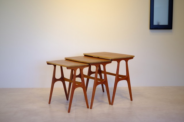 Erling Torvits(エーリング・トロヴィッツ)デザインのネストテーブル、No.40というモデルナンバーが付けられています。 北欧ならではの省スペース家具、ネスト(巣・入れ子)テーブル。大中小3つのテーブルで構成されており、それぞれが巣に戻るように入れ子になって収納されます。普段は重ねておき、使うときだけ出すことがスタンダードな使い方かもしれませんが、それぞれを個別に使うことももちろん可能です。 デザイン面で特徴的なのは、彫刻のような繊細なデザインの脚部で、大中小それぞれのテーブルで形状が微妙に異なるのもまた魅力的。それぞれ分割した状態でも、収納した状態でも、その姿がとても美しく、見とれてしまうような魅力を持っています。 もしも子どもが3人いたら、それぞれを分けて色んな用途で傷だらけになるまで使わせたいです。大きくなって使わなくなったら回収し、その傷を眺めながにんまりしたいです笑 [商品ID]2530b24420 [デザイナー]Erling Torvits(エーリング・トロヴィッツ) [製造]Heltborg Mobler(ヘルトボルグ・モブラー) [サイズ] 大 W55.5cm D36cm H52cm 中 W49.5cm D33.5cm H49.5cm 小 W43cm D30.5cm H48cm [送料ランク]A