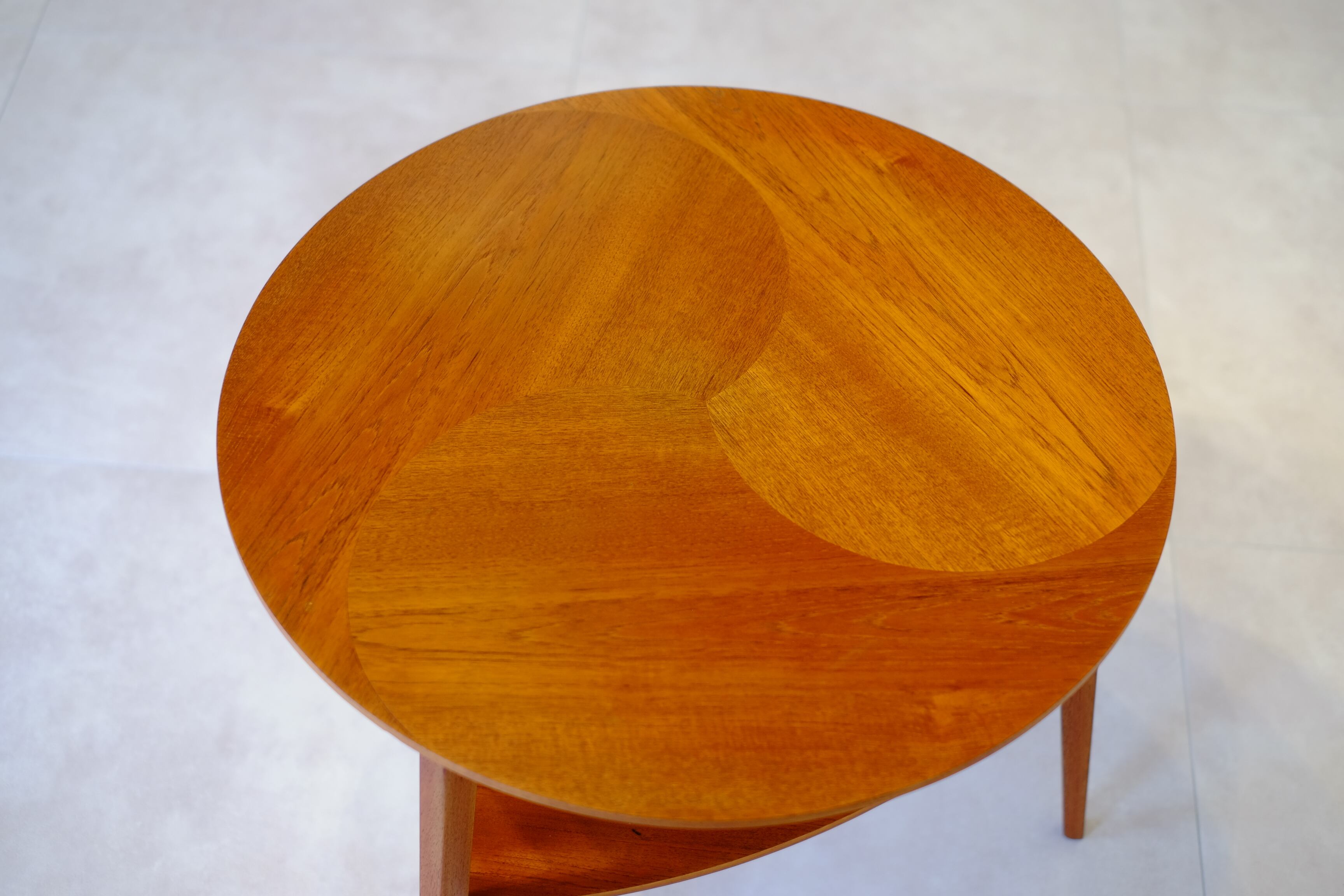 天板は円形なのに棚板は丸みを帯びた三角形、デザイン的に合うはずがなさそうなのにこれらをすっきりとしたテーパー形状の3本足が結ぶと、不思議と定番デザインかのように思えてくる美しさ。天板も3等分にデザインされており、その中にも三角形が見えてきます。意図したデザインなのだと思いますが、見る角度によって表情が変わり、ずっと見ていても飽きないどころか引き込まれる魅力的なデザイン。