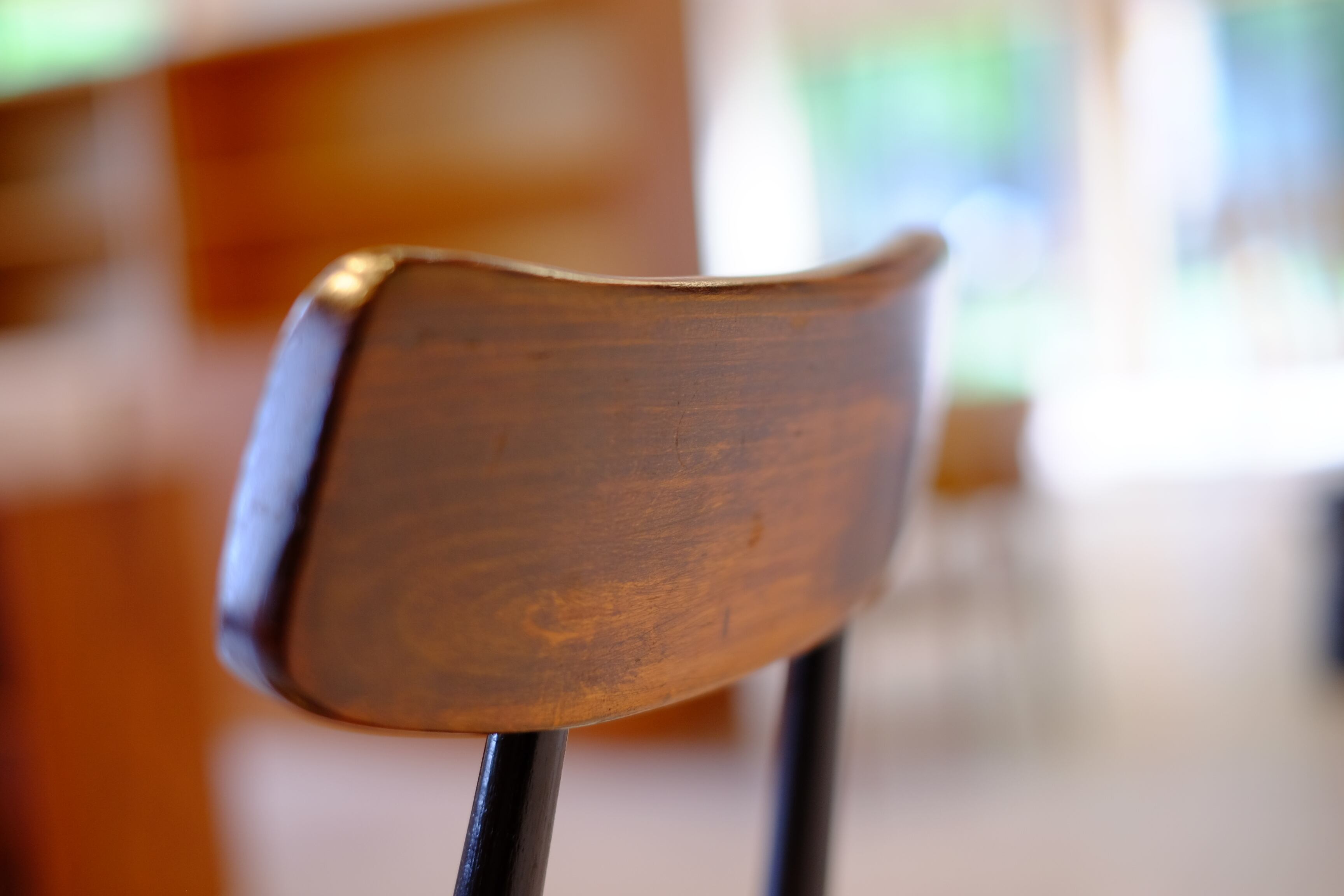 素材としてはパインが使われているので、柔らかさを感じる座面。少し低め(約42cm)に設定された座面高と相まって、小さい背もたれのわりにリラックスして座ることができます。