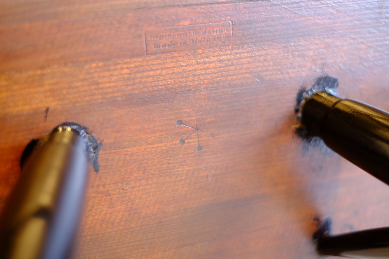 座面は左右2枚に分かれており、それを6つの太めの木ダボが繋ぎとめています。負荷を分散させるためなのか、意匠のためなのか、一連のピルッカシリーズではテーブルやスツールも同じ構造になっており、デザイン的に目立つ特徴のひとつになっています。