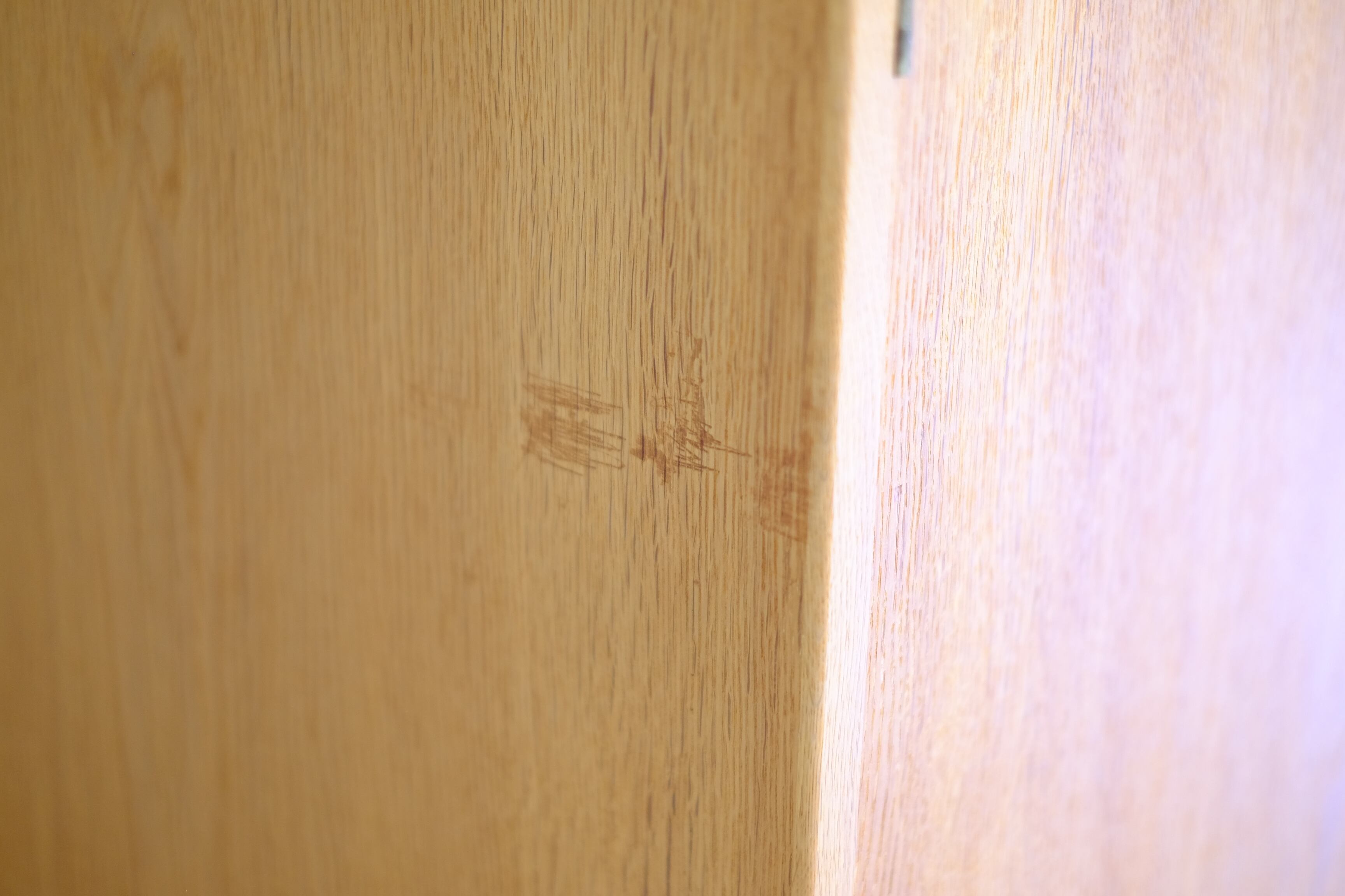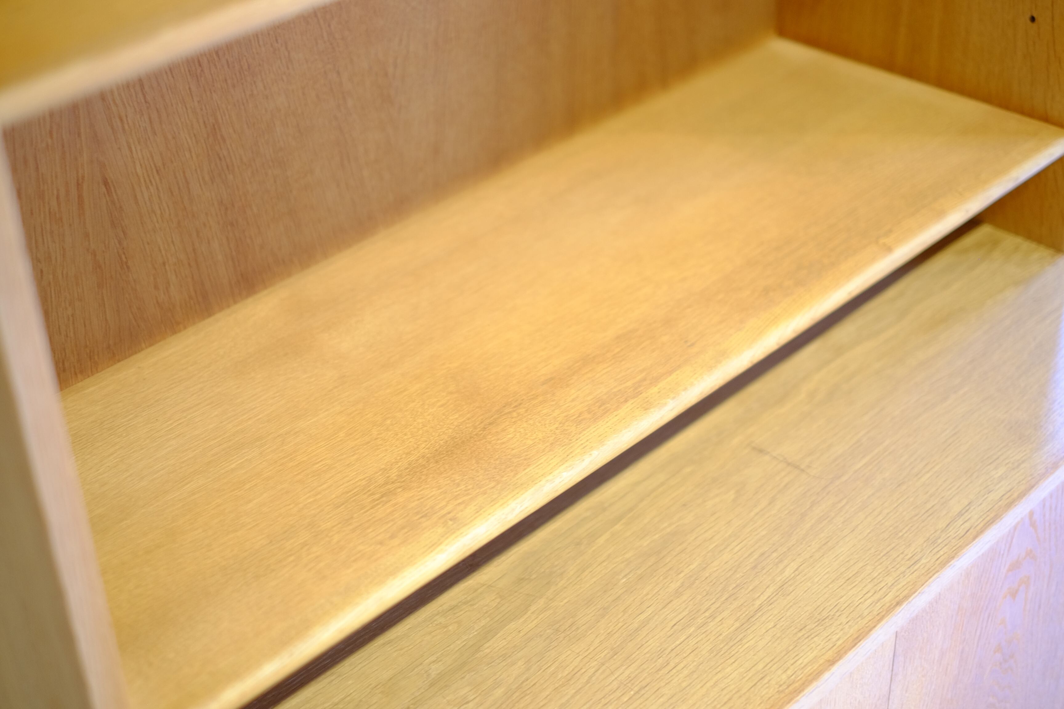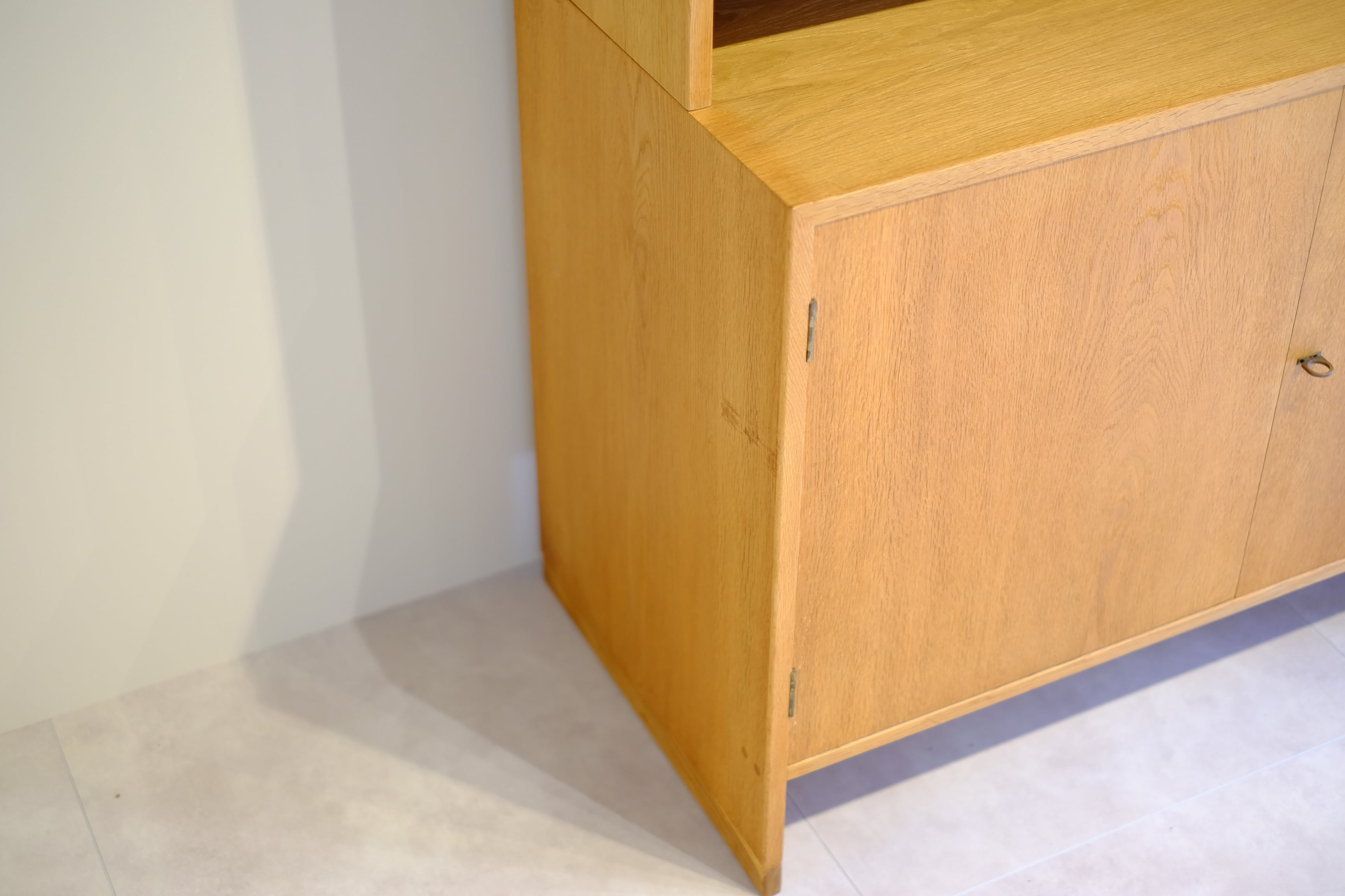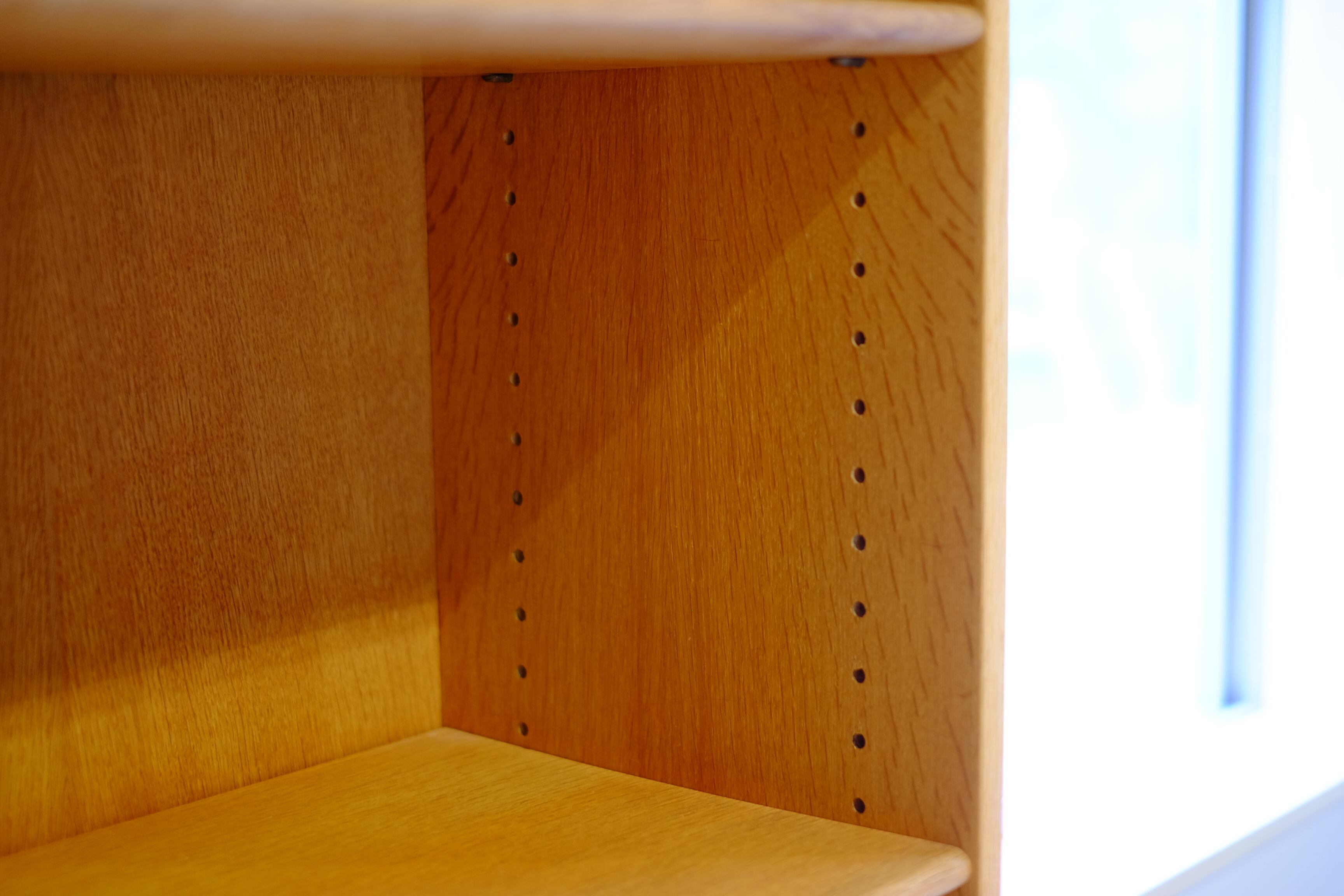 デザイン的にはシンプルな形状ですが、丸められた棚板の前面の仕上げや側面に見えるダボ、意図的に切り換えられている脚部、特有の取っ手など、様々な箇所にウェグナーのこだわりを感じることのできるシェルフです。
