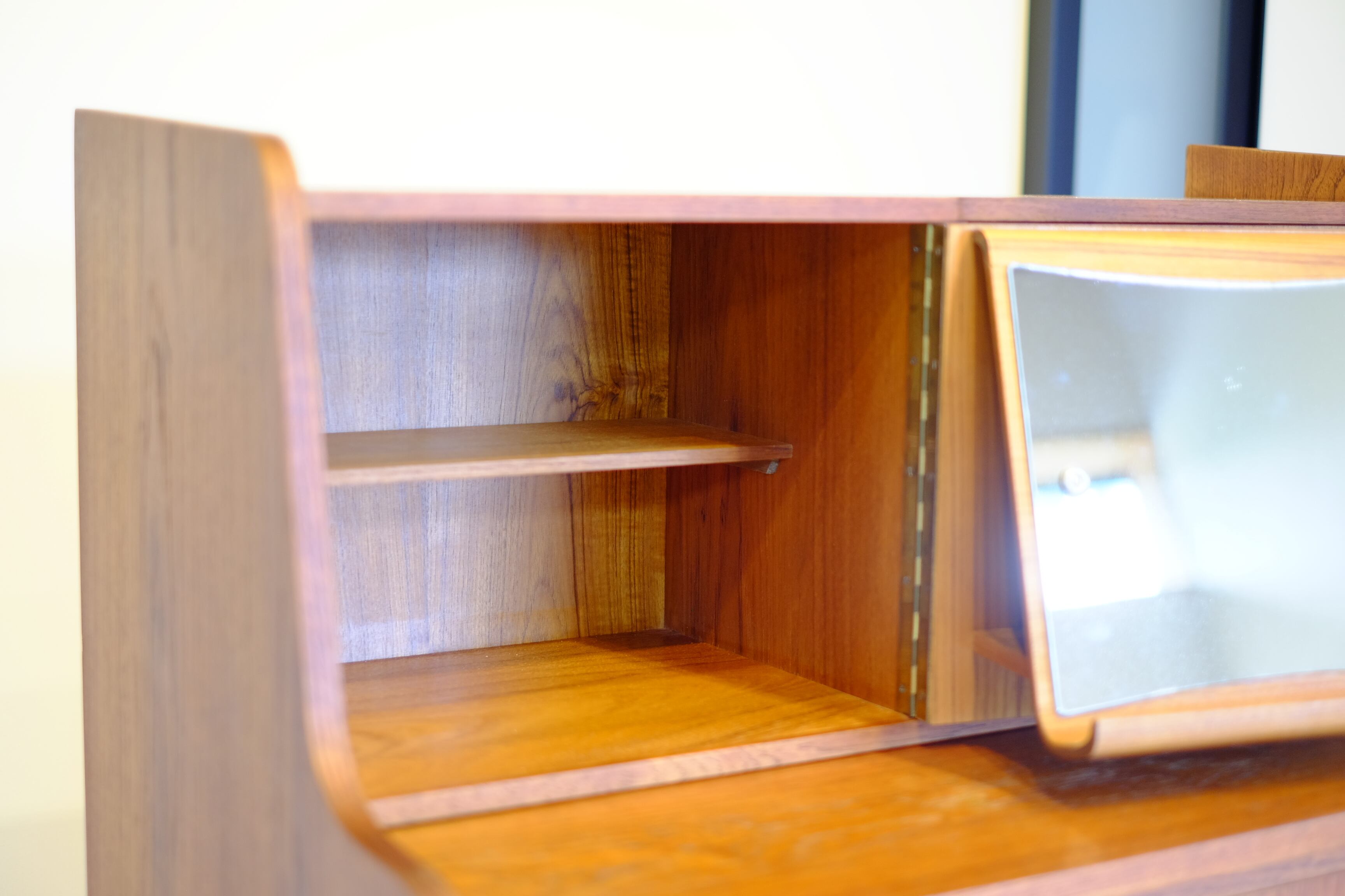 この商品は上下に4段ずつの引き出しがあり、机の部分は手前に引き出すことにより十分なスペースを確保できるようになっています。左上部の扉を開くとミラーが現れ、その中には2段に分かれた物入があります。ミラーの前部にもタブレットを置くのにちょうどよさそうな物受けがあり、ミラー裏も収納スペースがあります。
