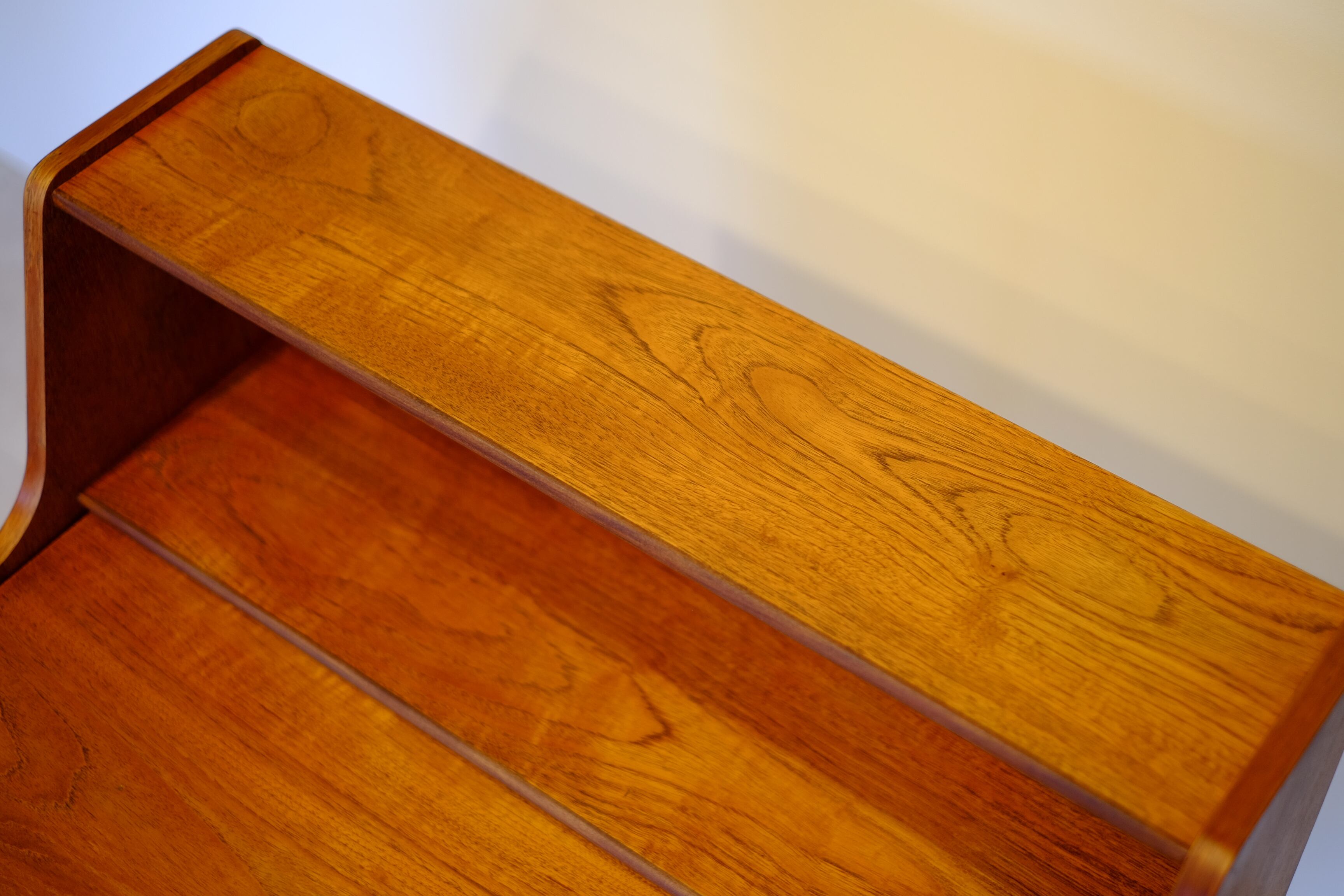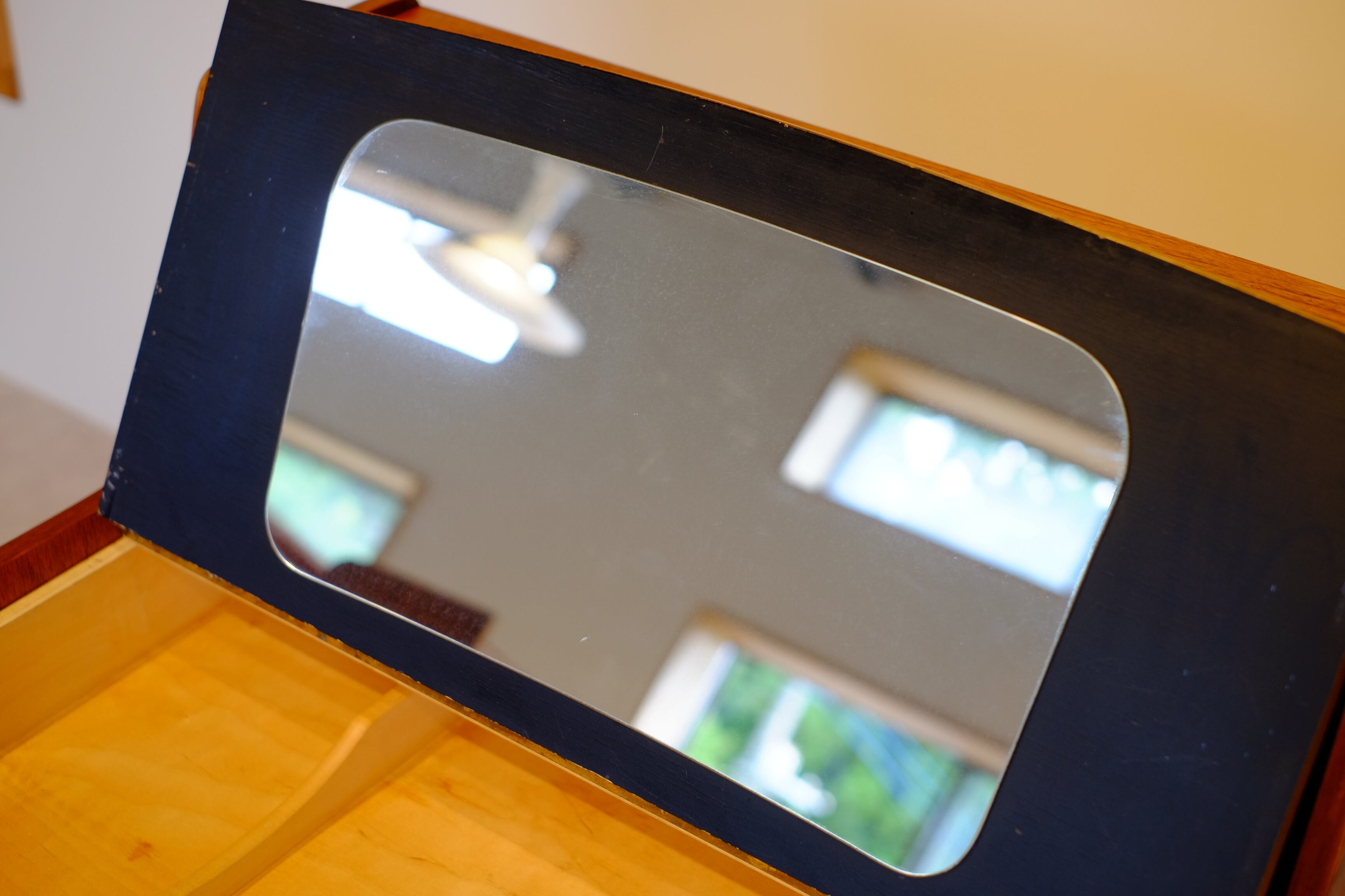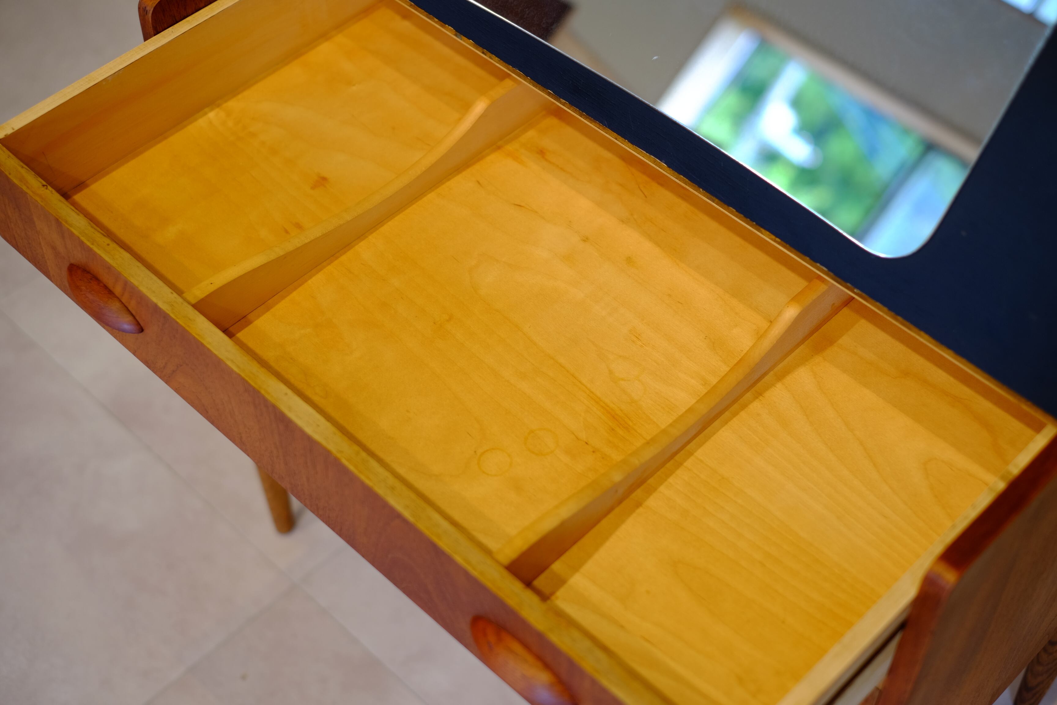 引出しは必要最低限の3段構成となり、一番上の段は天板と一緒に動く構造になっています。開くとやや大きめのミラーが現れ、引き出しの中には2枚の仕切りが設定されています。化粧道具やアクセサリーなどを入れるのに重宝しそう。
