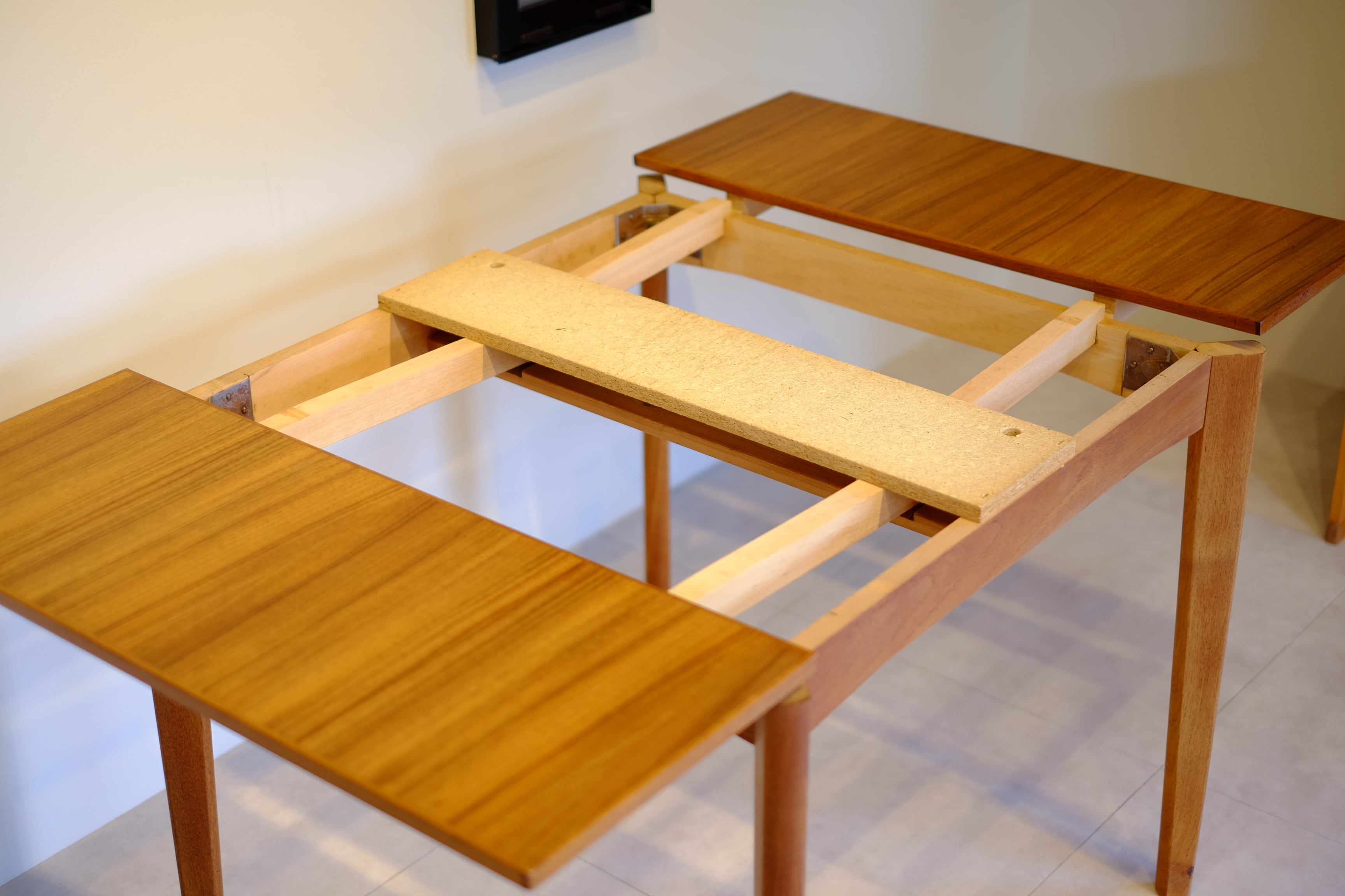 通常はメイン天板も二つに分かれていて、見た目からエクステンション付とわかるものが多いですが、こちらはメイン天板が1枚になっているデザイン。メインの天板を持ち上げると下に2枚のエクステンションテーブルが隠れていて、それを広げることのできる仕組みになっています。