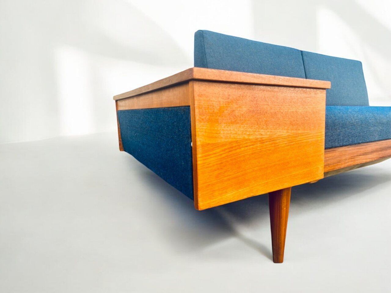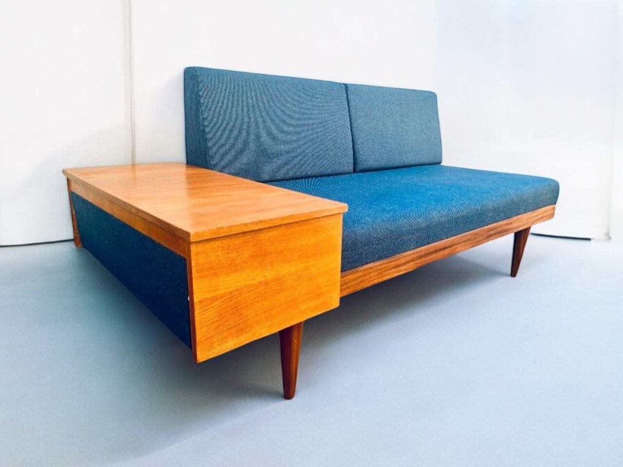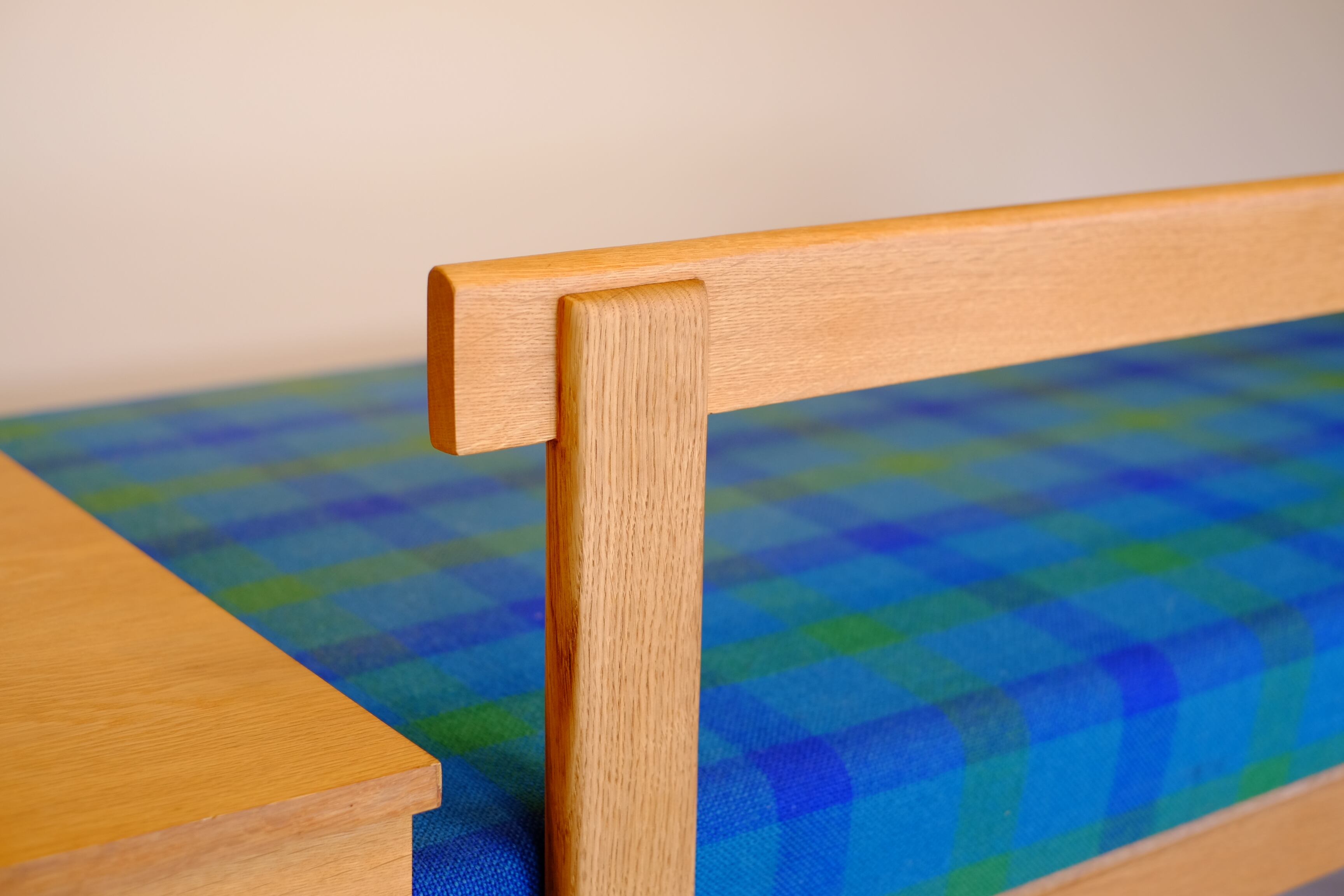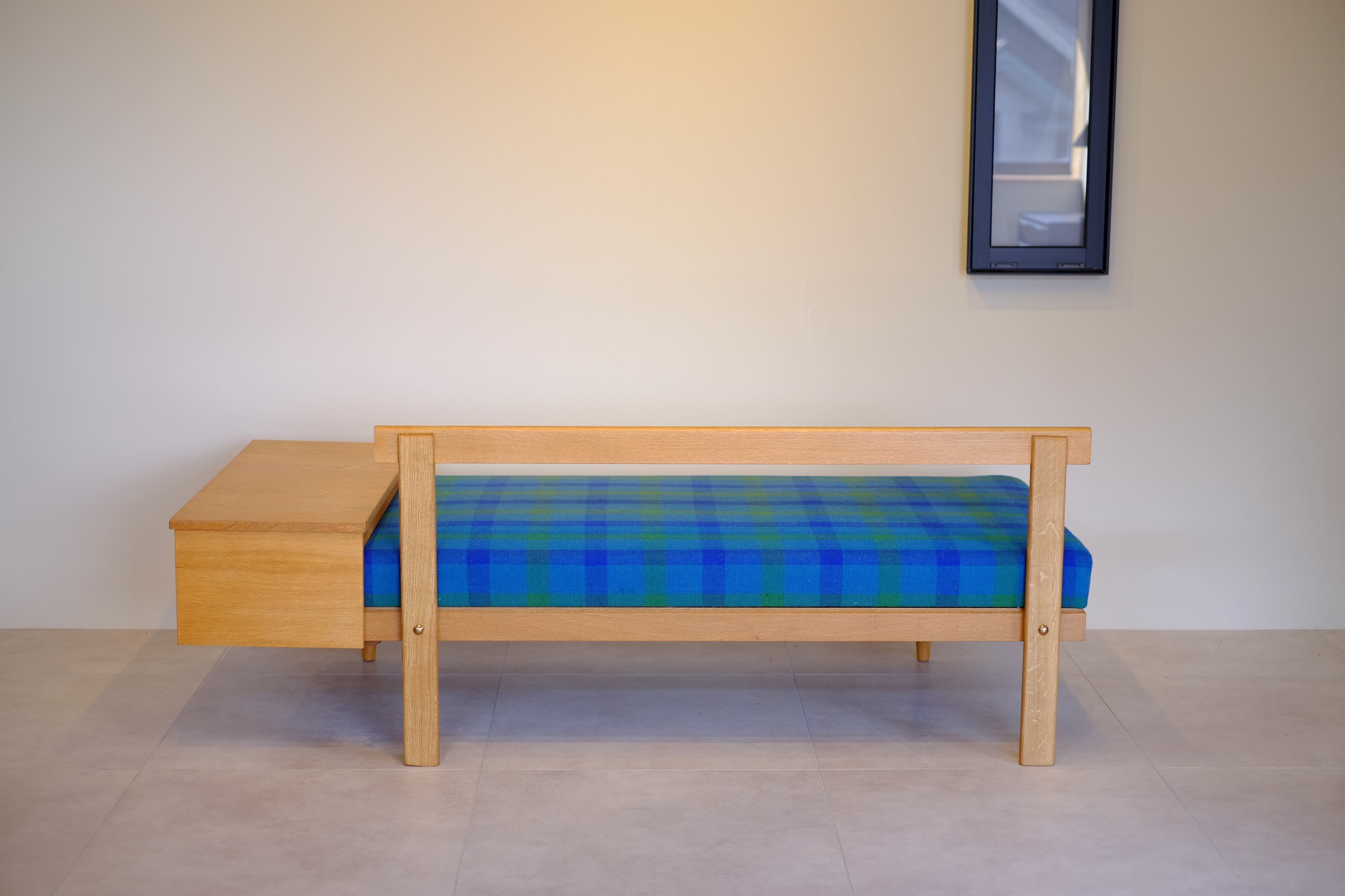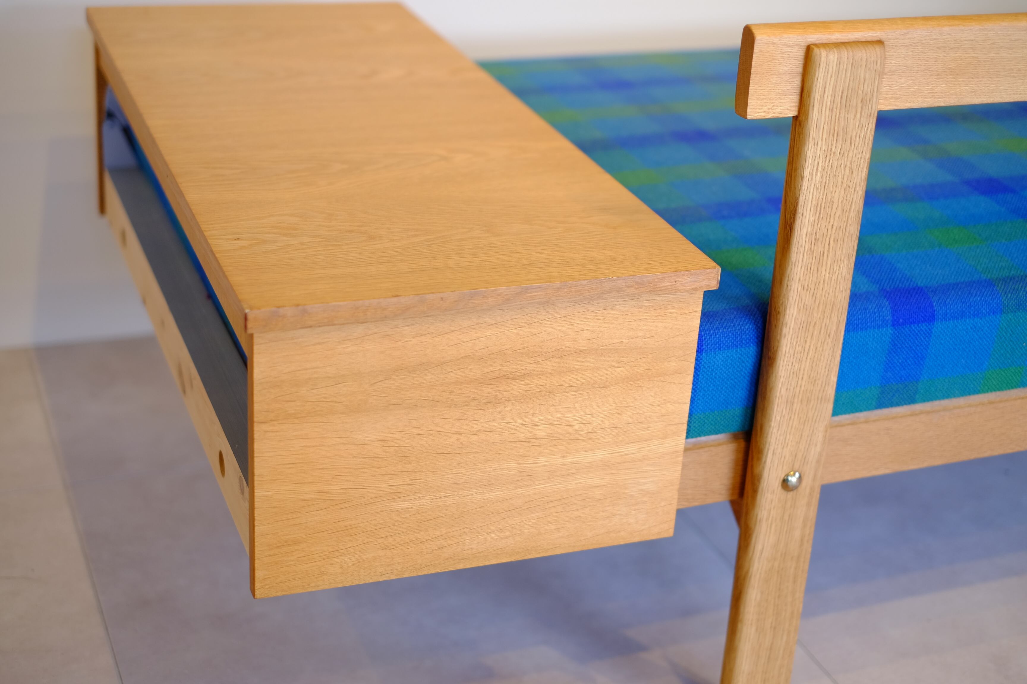 その特徴は何といってもその姿を変える仕組み。サイドテーブルとなっている部分を展開し、背もたれのクッションをそこに移動させるとデイベッドへ変化する構造になっています。座面のマットレスを持ち上げればそこにはブランケットなどの収納スペースがあります。シンプルなデザインとミニマリズム、エレガンス、そして妥協しない品質がキーコンセプトと言われる彼のデザインをとてもよく表しています。